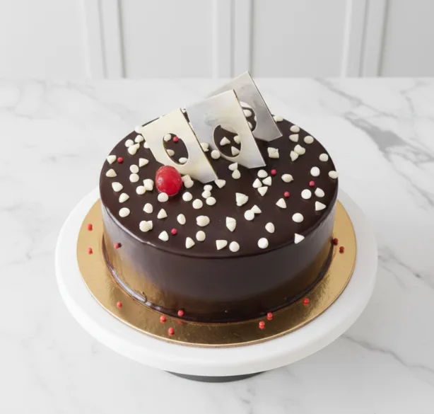 A rich chocolate cake with a glossy finish, topped with white chocolate chips, red accents, and elegant decorations — perfect for indulging in pure cocoa luxury.