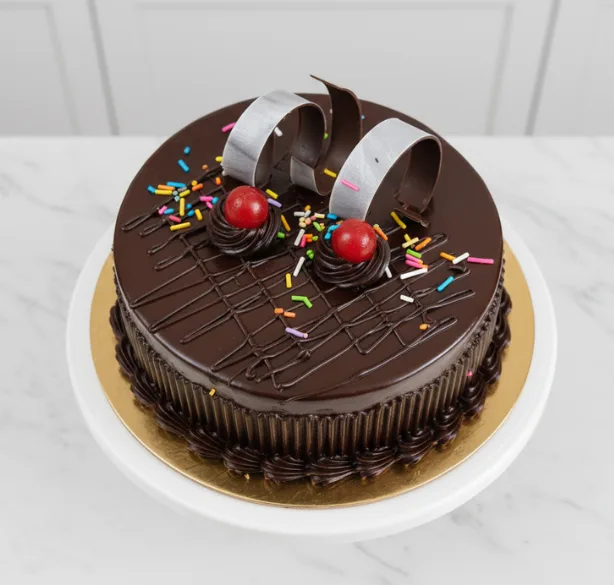 Meet the dessert that beautifully blends sophistication and fun — our glossy chocolate cake! Topped with intricate chocolate loops, vibrant sprinkles, and cherry accents, this masterpiece promises to satisfy your cravings while catching everyone’s eye. Perfect for all occasions, it combines rich flavors with a visually stunning presentation, making it a centerpiece that tastes as good as it looks.