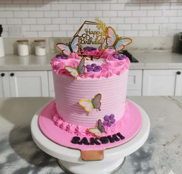 Designed to delight, this pink buttercream cake is lovingly crafted with precision and care. The smooth, pastel buttercream base is beautifully highlighted with vibrant butterflies and intricate blossoms, ensuring every detail radiates charm. Each component is handcrafted to perfection, making it the ideal cake for creating cherished moments that everyone will remember.