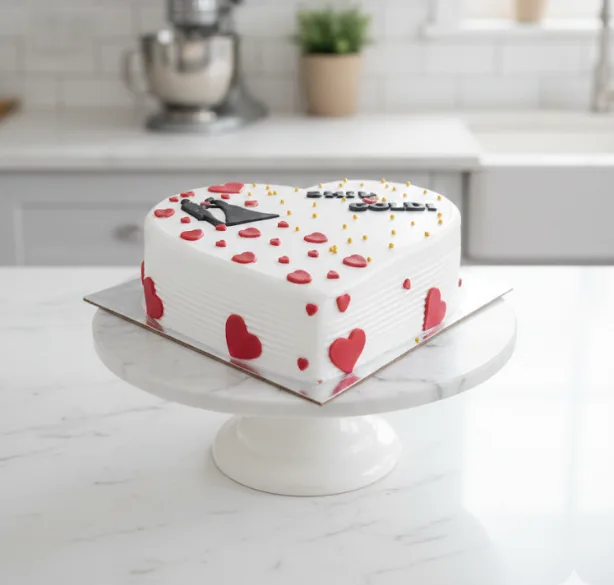A white heart-shaped cake sprinkled with red hearts and a cute couple design—crafted to make anniversaries, engagements, and special moments unforgettable.