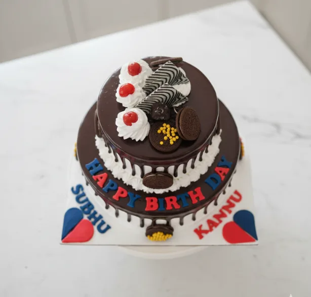 The sight of cake layers covered in smooth icing and surrounded by carefully chosen decorations will delight both your taste buds and eyes. The unique creamy texture and slight crunch of the cake comes from the perfect placement of the Oreo biscuits. The design is adorned with juicy cherries, which provide vibrant color and a tang that balances the richness of the chocolate. To make your celebration even more special and personal, the cake is decorated with a vibrant nameplate, making the day even more memorable.